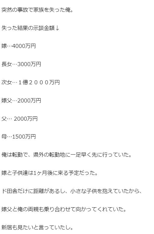 【突然の悲劇】警察『ご家族が亡くなりました』俺「は?」→嫁の価値4000万、次女1億2000万。事故で6人の家族と引換えに大金GET。俺「会社辞めさせて貰うわ」。